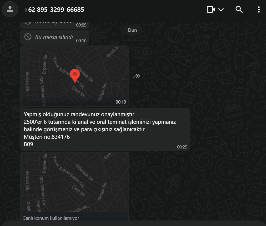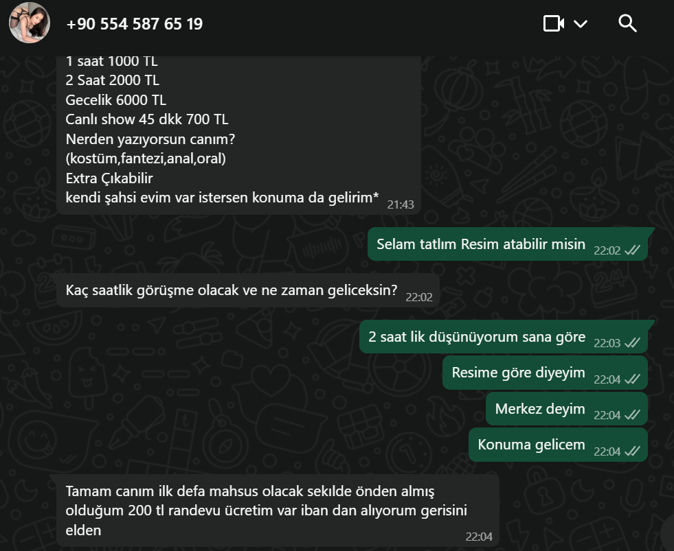 Görüşme öncesinde “konum atmak” bahanesiyle 200₺ civarında bir ön ödeme istendi. Ardından “masaj salonu ile ortak çalışıyoruz” denilerek güven sağlandı. Konuma gidildiğinde bu kez “vücuduma zarar verme, morluk bırakma sigortası” adı altında yaklaşık 800–1000₺ ek ücret talep edildi. Parayı öderseniz “zarfla geri verilecek” veya “ücretten düşülecek” denilerek oyalıyorlar.